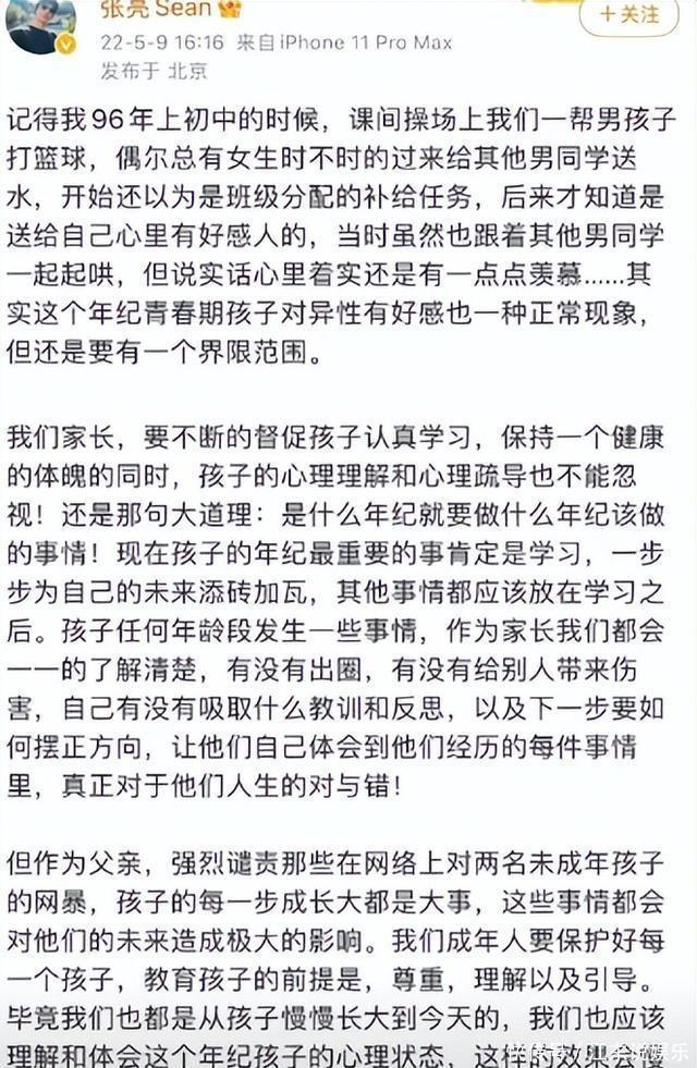 那个所谓的谈恋爱谣言,其实也就是几张模糊不清的照片。早年的时候就传过一次,当时张亮就说了,青春期对异性有好感很正常。只要不影响学习,家长要做的是引导不是打压,这话说的挺在理的。